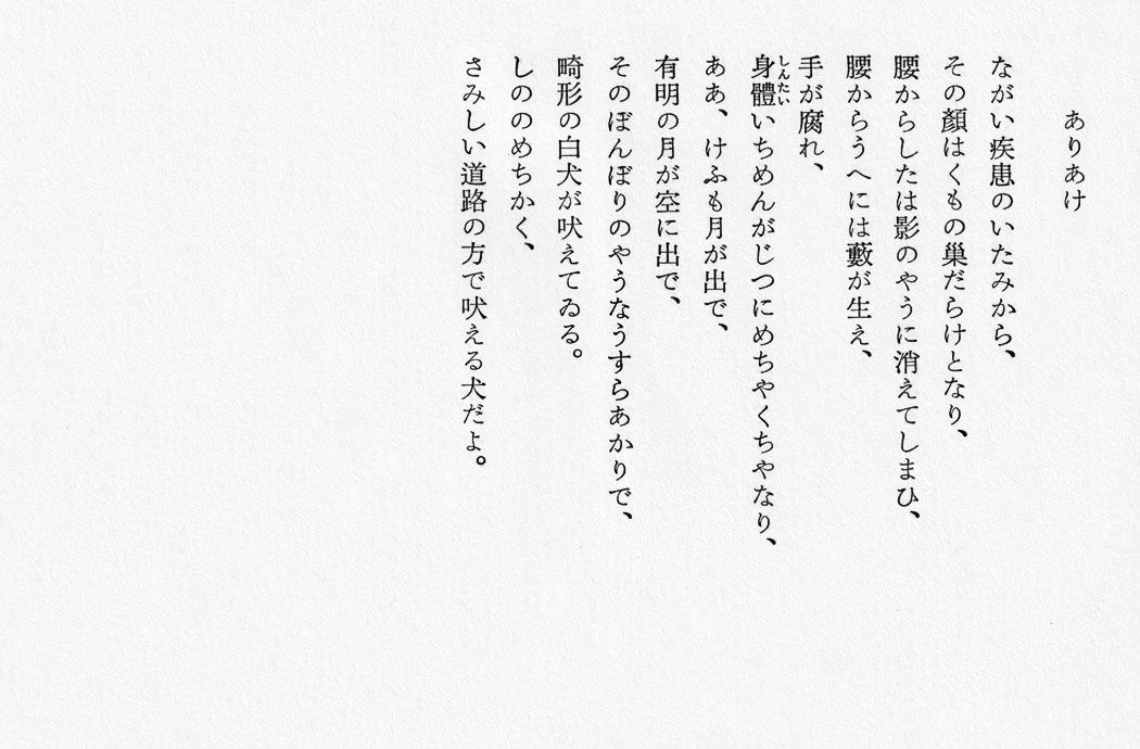 「ありあけ」(萩原朔太郎) 萩原朔太郎 2026.03.23 詩集『月に吠える』/那珂太郎「萩原朔太郎詩私解」 「地面の底の病気の顔」(萩原朔太郎) 詩を読む 「竹」(萩原朔太郎) 詩を読む 「殺人事件」(萩原朔太郎) 詩を読む 「蛙の死」(萩原朔太郎) 詩を読む 「内部に居る人が畸形な病人に見える理由」(萩原朔太郎) 詩を読む 「春夜」(萩原朔太郎) 詩を読む 「ありあけ」(萩原朔太郎) 詩を読む 「くさった蛤」(萩原朔太郎) 詩を読む