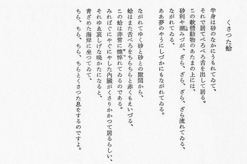 「くさった蛤」(萩原朔太郎) 萩原朔太郎 2026.03.24 詩集『月に吠える』/那珂太郎「萩原朔太郎詩私解」 「地面の底の病気の顔」(萩原朔太郎) 詩を読む 「竹」(萩原朔太郎) 詩を読む 「殺人事件」(萩原朔太郎) 詩を読む 「蛙の死」(萩原朔太郎) 詩を読む 「内部に居る人が畸形な病人に見える理由」(萩原朔太郎) 詩を読む 「春夜」(萩原朔太郎) 詩を読む 「ありあけ」(萩原朔太郎) 詩を読む 「くさった蛤」(萩原朔太郎) 詩を読む