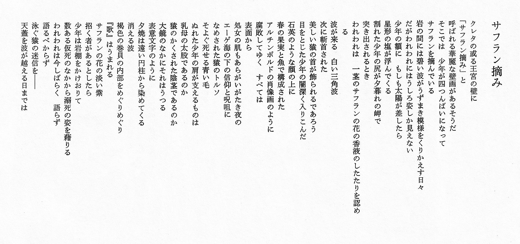 「サフラン摘み」(吉岡 実) 吉岡実 2026.01.16 詩集『サフラン摘み』(1976年)/現代史読本「吉岡 実」 「静物」(吉岡 実) 「樹」(吉岡 実) 「卵」(吉岡 実) 「過去」(吉岡 実) 「僧侶」(吉岡 実) 「苦力」(吉岡 実) 「サフラン摘み」(吉岡 実) 「ルイス・キャロルを探す方法」(吉岡 実) 「楽園」(吉岡 実) 「晩夏」(吉岡 実)