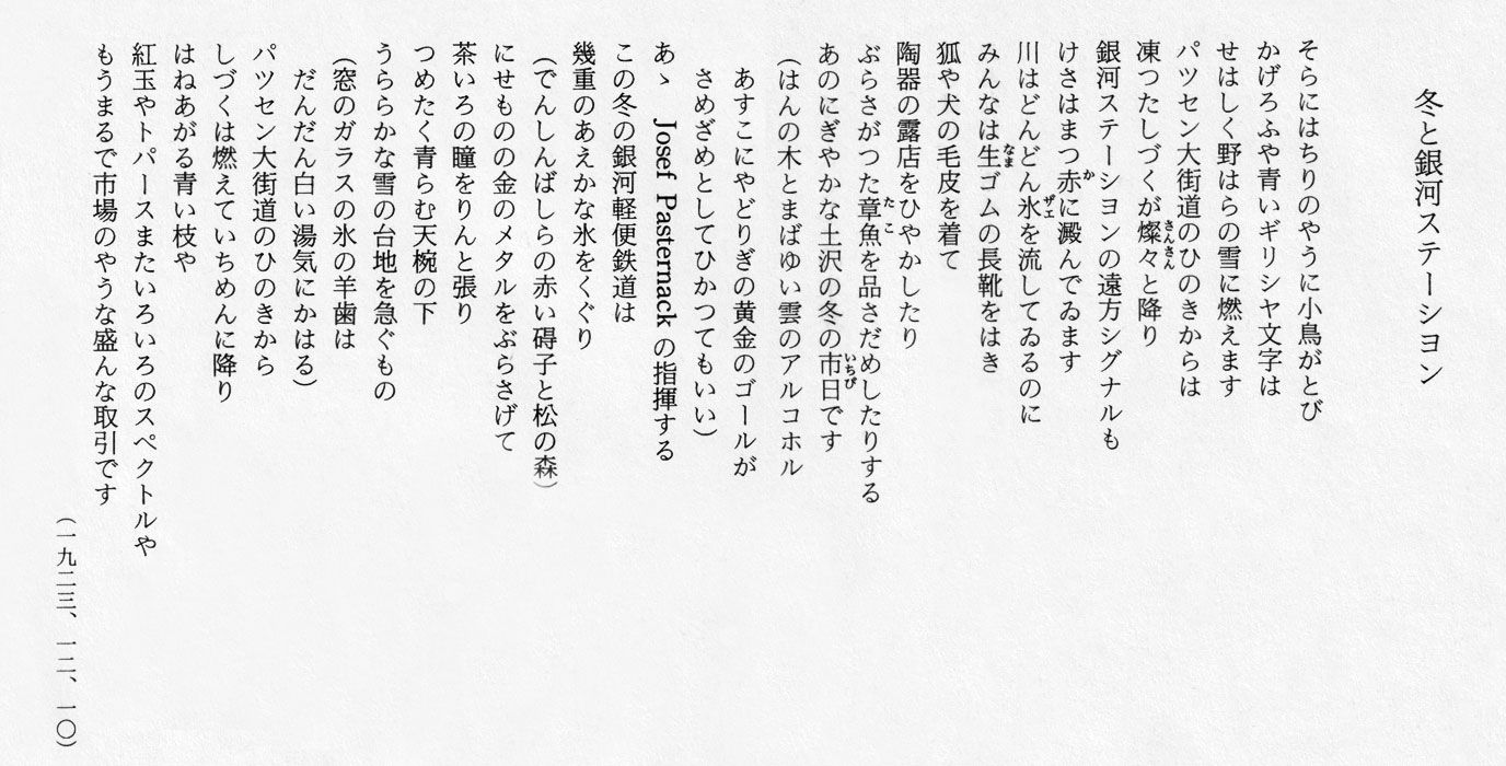 「冬と銀河ステーション」(宮沢賢治) 宮沢賢治 2026.01.29 宮沢賢治全集 Ⅰ「風景とオルゴール」(ちくま文庫) 春と修羅「序」(宮沢賢治) 「屈折率」「くらかけの雪」(宮沢賢治) 「春と修羅」(宮沢賢治) 「休息」(宮沢賢治) 「原体剣舞連」(宮沢賢治) 「永訣の朝」(宮沢賢治) 「松の針」(宮沢賢治) 「無声慟哭」(宮沢賢治) 「風景とオルゴール」(宮沢賢治) 「冬と銀河ステーション」(宮沢賢治)