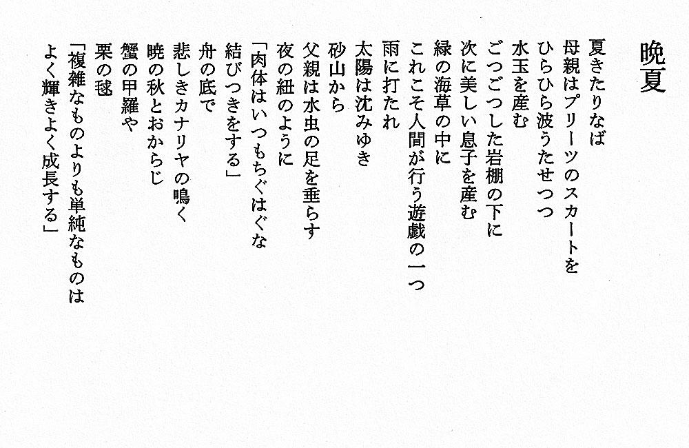 「晩夏」(吉岡 実) 吉岡実 2026.01.22 詩集『夏の宴』(1979年)/現代史読本「吉岡 実」 「静物」(吉岡 実) 「樹」(吉岡 実) 「卵」(吉岡 実) 「過去」(吉岡 実) 「僧侶」(吉岡 実) 「苦力」(吉岡 実) 「サフラン摘み」(吉岡 実) 「ルイス・キャロルを探す方法」(吉岡 実) 「楽園」(吉岡 実) 「晩夏」(吉岡 実)