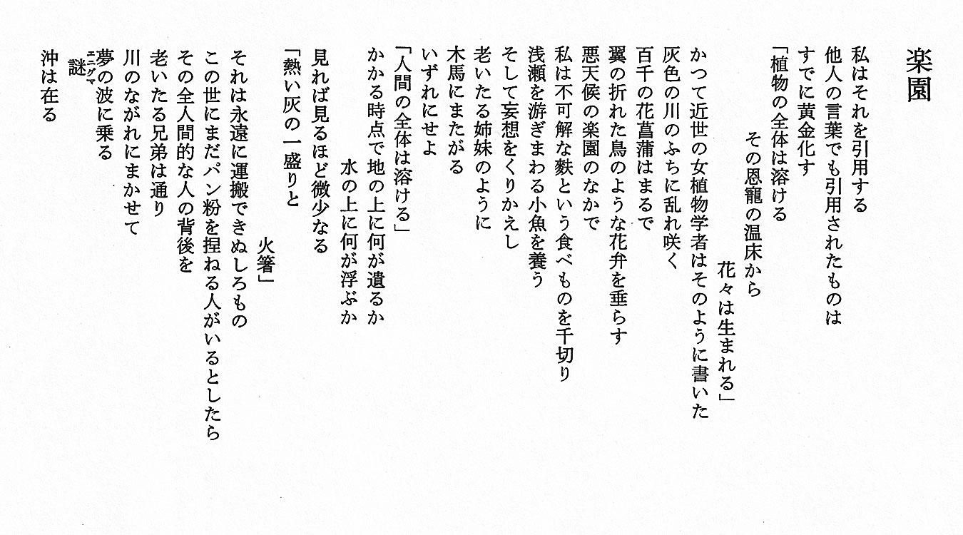 「楽園」(吉岡 実) 吉岡実 2026.01.22 詩集『夏の宴』(1979年)/現代史読本「吉岡 実」 「静物」(吉岡 実) 「樹」(吉岡 実) 「卵」(吉岡 実) 「過去」(吉岡 実) 「僧侶」(吉岡 実) 「苦力」(吉岡 実) 「サフラン摘み」(吉岡 実) 「ルイス・キャロルを探す方法」(吉岡 実) 「楽園」(吉岡 実) 「晩夏」(吉岡 実)