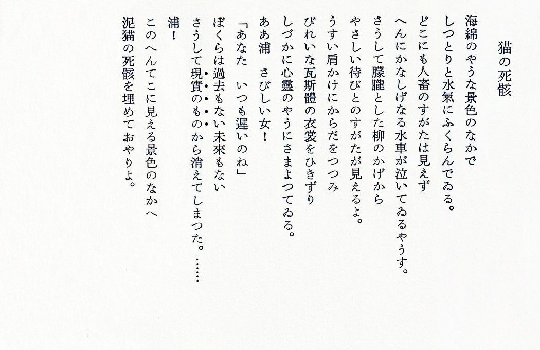 「猫の死骸」(萩原朔太郎) 萩原朔太郎2026.04.13『青猫』以後/那珂太郎「萩原朔太郎詩私解」 「地面の底の病気の顔」(萩原朔太郎) 詩を読む 「竹」(萩原朔太郎) 詩を読む 「殺人事件」(萩原朔太郎) 詩を読む 「蛙の死」(萩原朔太郎) 詩を読む 「内部に居る人が畸形な病人に見える理由」(萩原朔太郎) 詩を読む 「春夜」(萩原朔太郎) 詩を読む 「ありあけ」(萩原朔太郎) 詩を読む 「くさった蛤」(萩原朔太郎) 詩を読む 「愛憐」(萩原朔太郎) 詩を読む 「見知らぬ犬」(萩原朔太郎) 詩を読む 「薄暮の部屋」(萩原朔太郎) 詩を読む 「沖を眺望する」(萩原朔太郎) 詩を読む 「恐ろしく憂鬱なる」(萩原朔太郎) 詩を読む 「黒い風琴」(萩原朔太郎) 詩を読む 「鶏」(萩原朔太郎) 詩を読む 「灰色の道」(萩原朔太郎) 詩を読む 「風船乗りの夢」(萩原朔太郎) 詩を読む 「荒寥地方」(萩原朔太郎) 詩を読む 「猫の死骸」(萩原朔太郎) 詩を読む 「夜汽車」(萩原朔太郎) 詩を読む