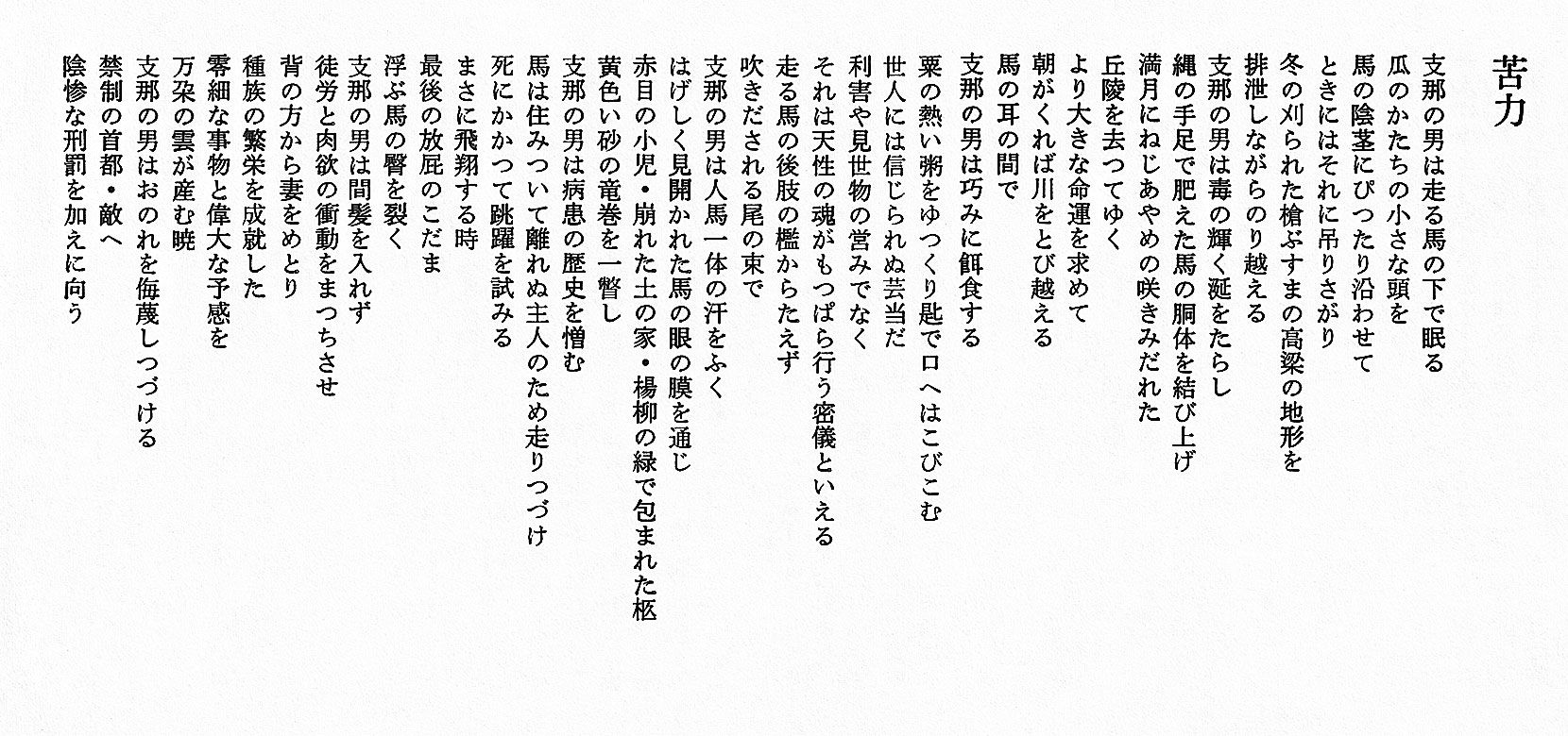 「苦力」(吉岡 実) 吉岡実 2026.01.15 詩集『僧侶』(1958年)/現代史読本「吉岡 実」 「静物」(吉岡 実) 「樹」(吉岡 実) 「卵」(吉岡 実) 「過去」(吉岡 実) 「僧侶」(吉岡 実) 「苦力」(吉岡 実) 「サフラン摘み」(吉岡 実) 「ルイス・キャロルを探す方法」(吉岡 実) 「楽園」(吉岡 実) 「晩夏」(吉岡 実)