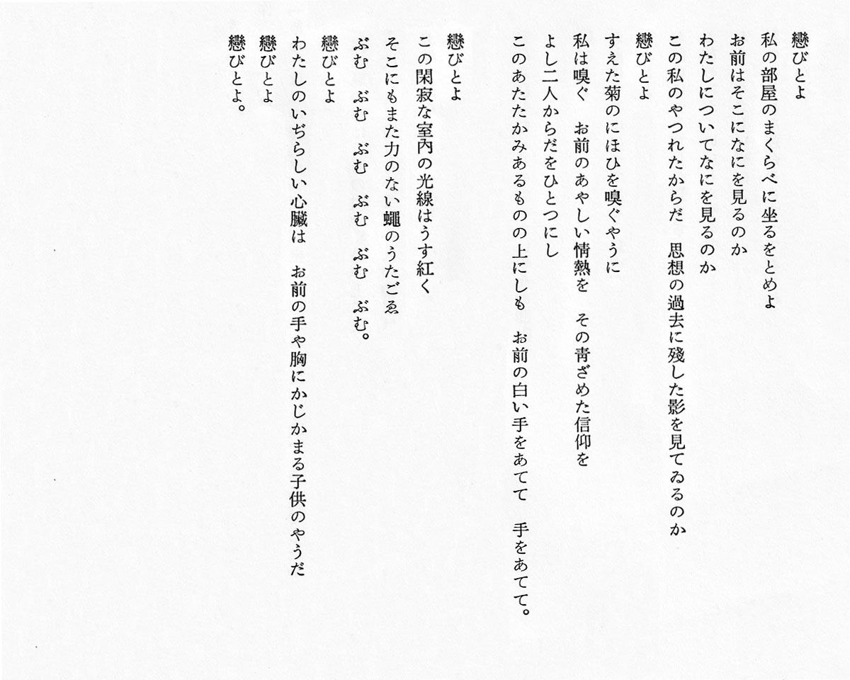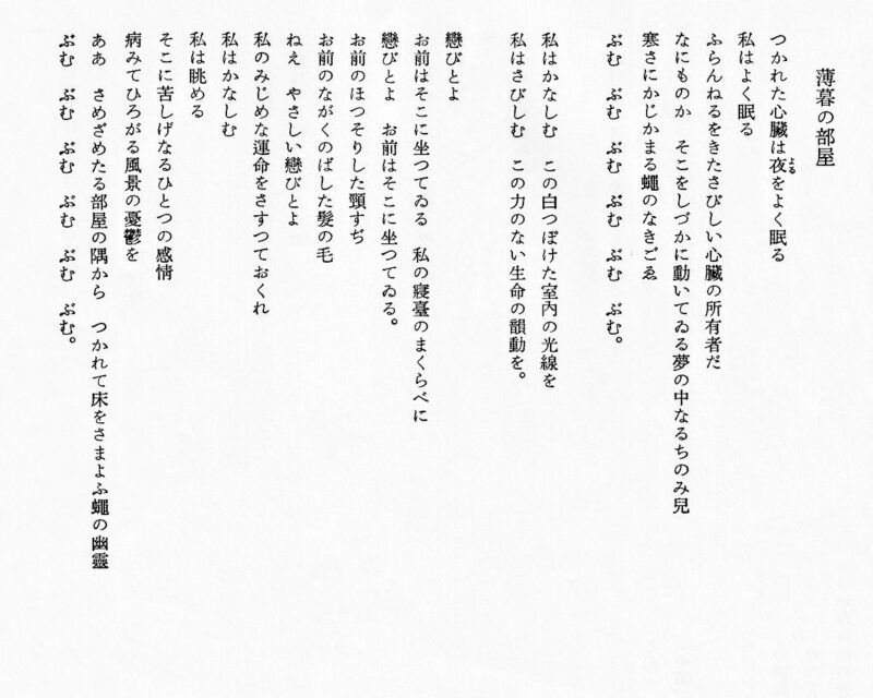 「薄暮の部屋」(萩原朔太郎) 萩原朔太郎 2026.03.31 詩集『青猫』/那珂太郎「萩原朔太郎詩私解」 「地面の底の病気の顔」(萩原朔太郎) 詩を読む 「竹」(萩原朔太郎) 詩を読む 「殺人事件」(萩原朔太郎) 詩を読む 「蛙の死」(萩原朔太郎) 詩を読む 「内部に居る人が畸形な病人に見える理由」(萩原朔太郎) 詩を読む 「春夜」(萩原朔太郎) 詩を読む 「ありあけ」(萩原朔太郎) 詩を読む 「くさった蛤」(萩原朔太郎) 詩を読む 「愛憐」(萩原朔太郎) 詩を読む 「見知らぬ犬」(萩原朔太郎) 詩を読む 「薄暮の部屋」(萩原朔太郎) 詩を読む 「沖を眺望する」(萩原朔太郎) 詩を読む 「恐ろしく憂鬱なる」(萩原朔太郎) 詩を読む 「黒い風琴」(萩原朔太郎) 詩を読む 「鶏」(萩原朔太郎) 詩を読む 「灰色の道」(萩原朔太郎) 詩を読む