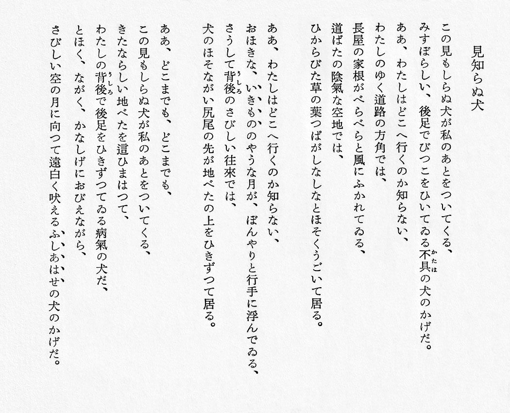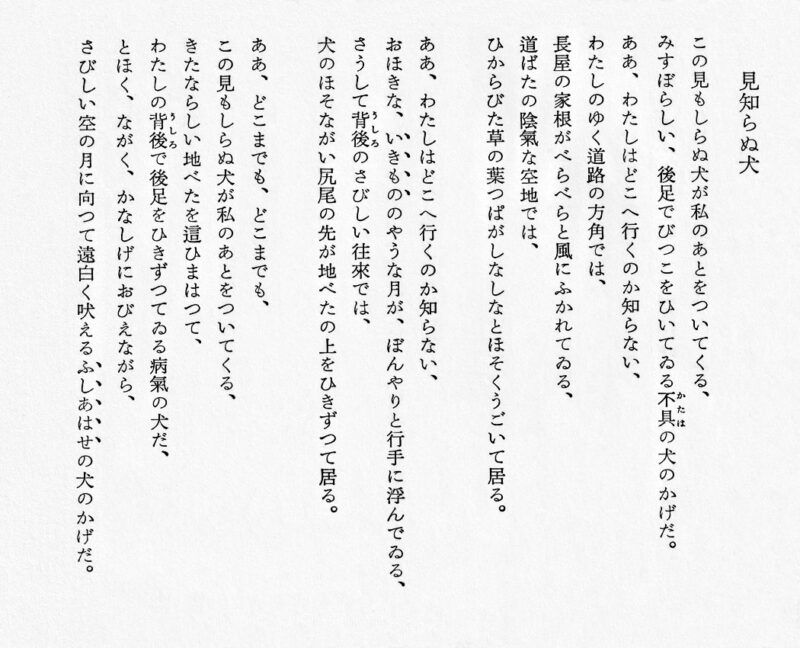 「見知らぬ犬」(萩原朔太郎) 萩原朔太郎2026.03.30詩集『月に吠える』/那珂太郎「萩原朔太郎詩私解」 「地面の底の病気の顔」(萩原朔太郎) 詩を読む 「竹」(萩原朔太郎) 詩を読む 「殺人事件」(萩原朔太郎) 詩を読む 「蛙の死」(萩原朔太郎) 詩を読む 「内部に居る人が畸形な病人に見える理由」(萩原朔太郎) 詩を読む 「春夜」(萩原朔太郎) 詩を読む 「ありあけ」(萩原朔太郎) 詩を読む 「くさった蛤」(萩原朔太郎) 詩を読む 「愛憐」(萩原朔太郎) 詩を読む 「見知らぬ犬」(萩原朔太郎) 詩を読む