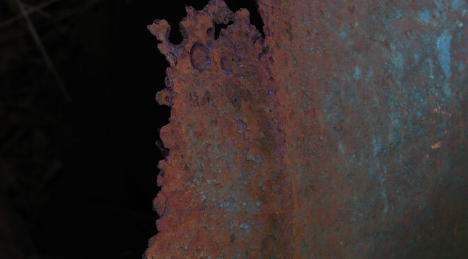 この写真、ただの錆びた鉄の断片ではなく、崩壊と生成が同居している瞬間が写っています。酸化で金属が朽ちていく過程なのに、光の加減で青緑から紫、赤錆までが微妙にグラデーションしていて、まるで風景画のようです。