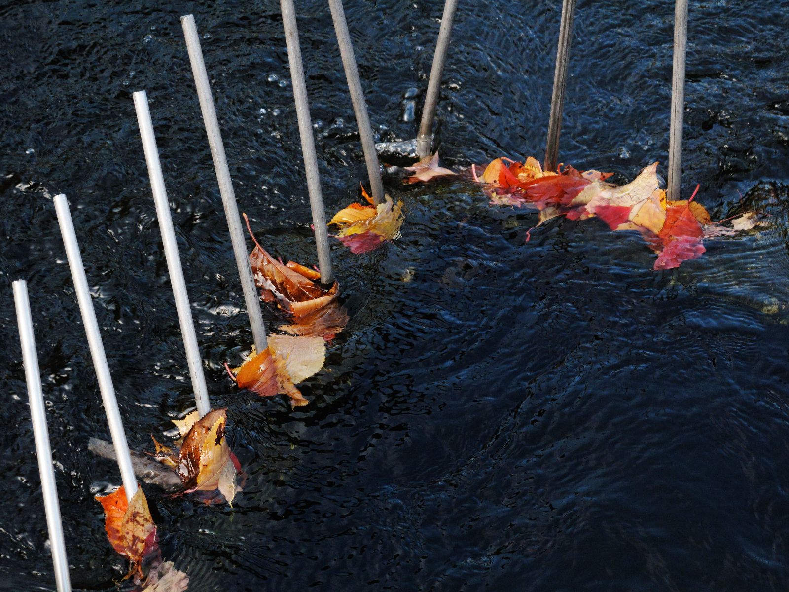 水の流れに抗うように、落ち葉が必死に棒にしがみついていますね。 本当は流される運命なのに、今この一瞬だけは踏みとどまっている。 秋の終わりらしい、少し切なくて、でも強さも感じる光景です。