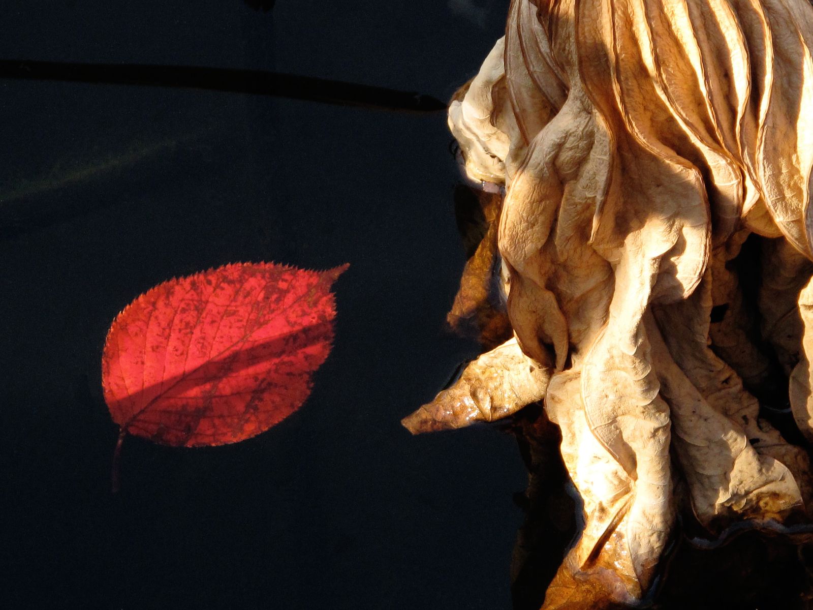 写真、かなり良いですね。 赤い葉と枯れた葉の造形、その“対比”がすごく効いています。