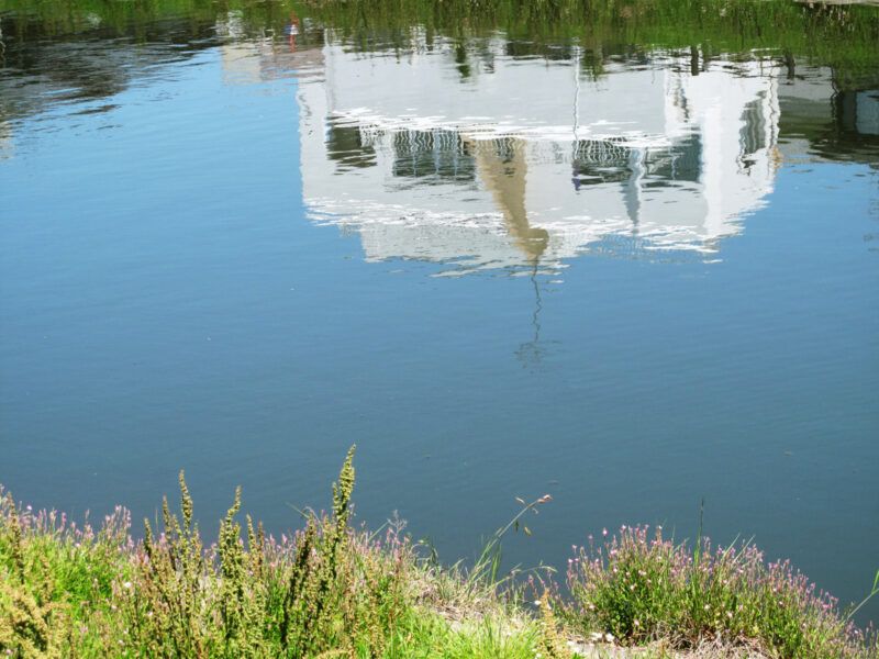 水面に映った白い建物が、現実の建築物というよりも、
