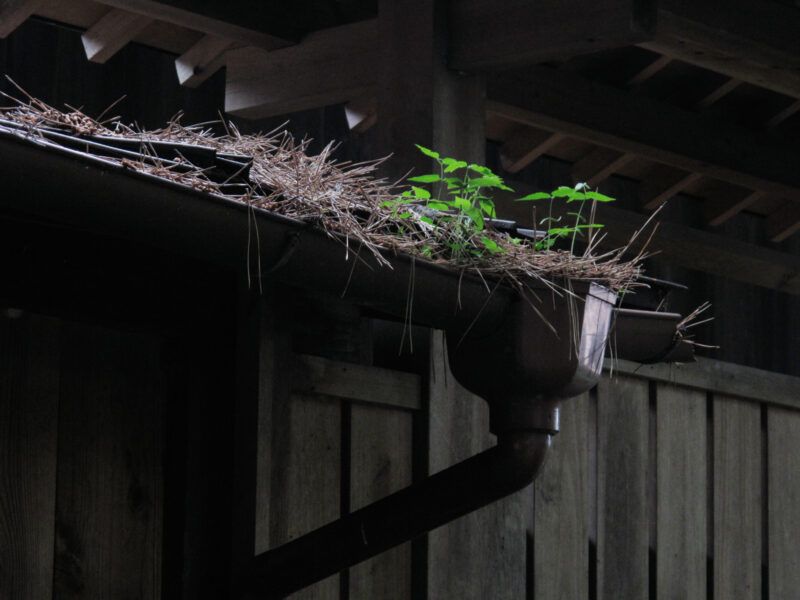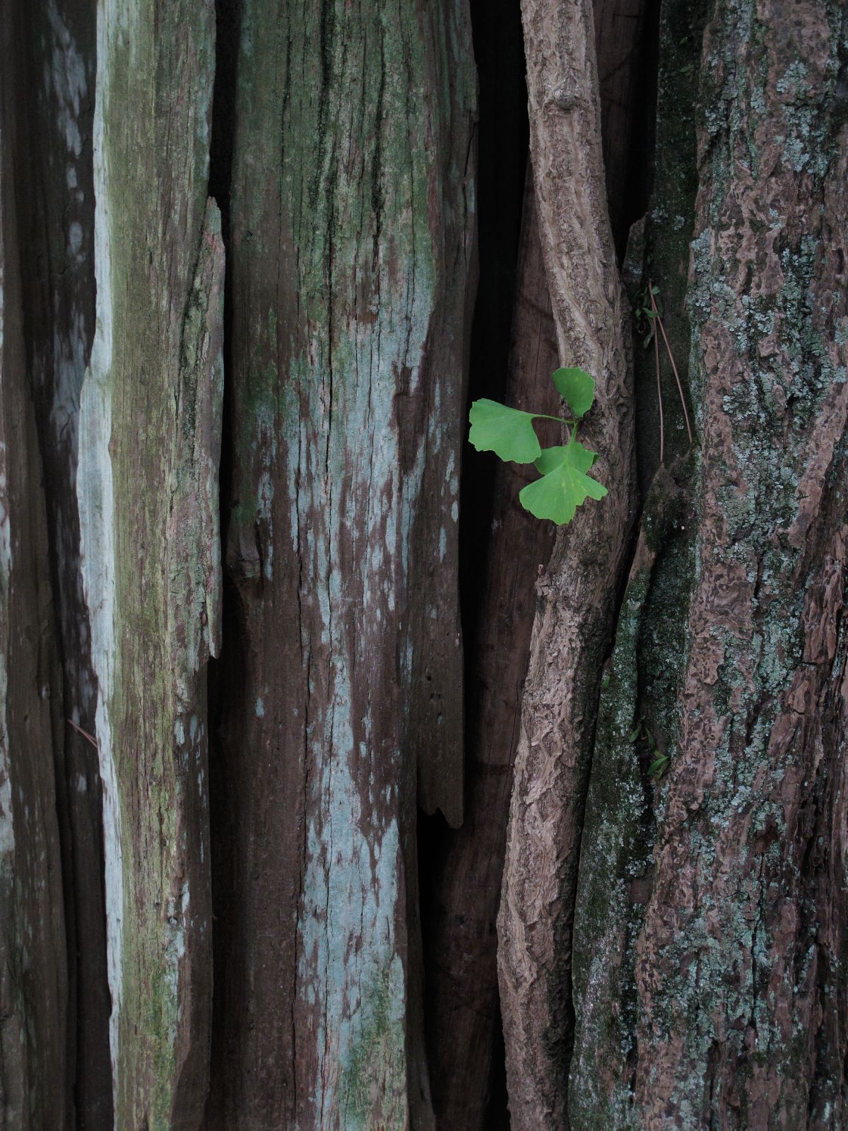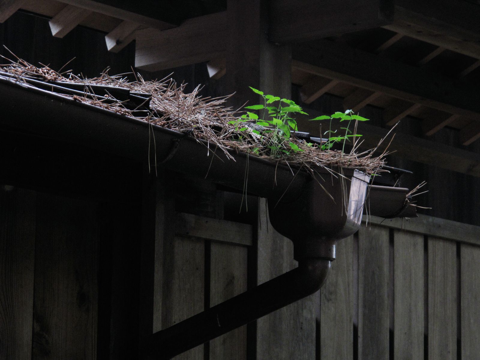 人の作った構造物、枯れた針葉、暗い屋根裏。その中で、若い緑が“居場所を勝ち取っている”。