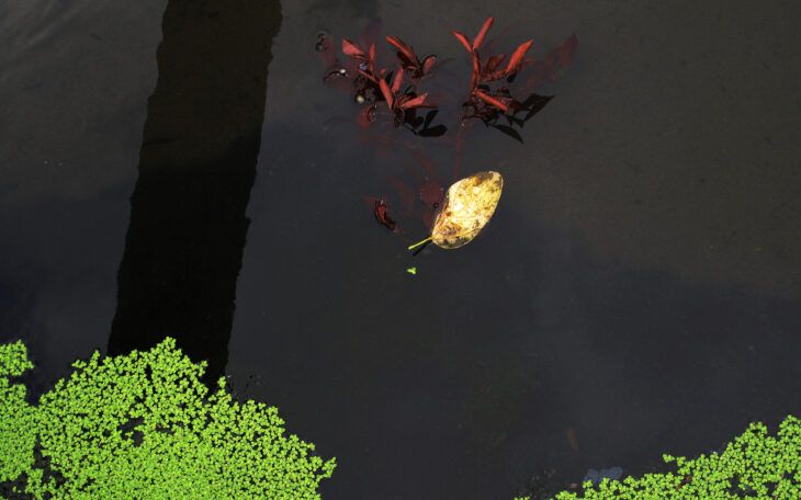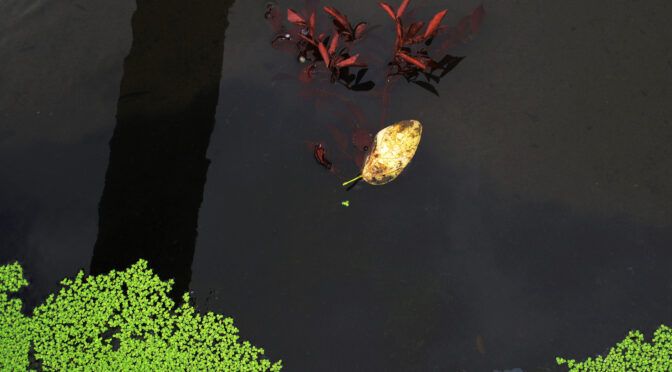 黒く沈んだ水面に、金色の葉と深紅の水草、そして端の鮮やかな緑。