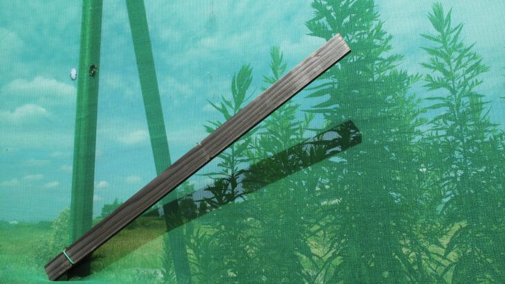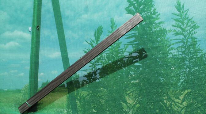 緑のネット越しに見える植物の影や、空の青とのコントラストが爽やかで印象的です。真ん中の金属の棒(あるいは支柱)も、光の反射や影が加わって構図のバランスを取っています。