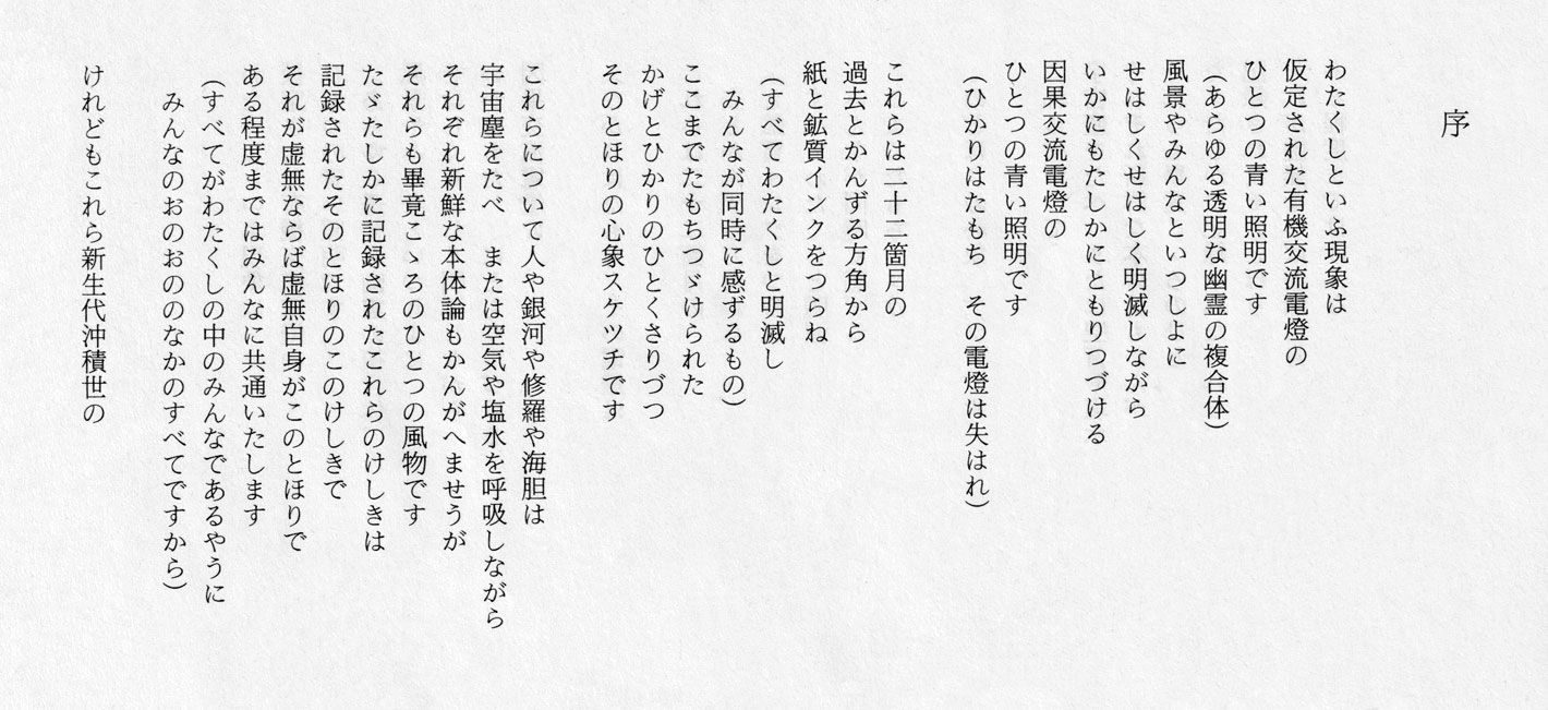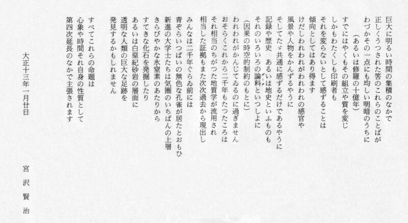 春と修羅「序」(宮沢賢治) 宮沢賢治 2026.01.23 「宮沢賢治全集 Ⅰ」(ちくま文庫) 春と修羅「序」(宮沢賢治) 「屈折率」「くらかけの雪」(宮沢賢治) 「春と修羅」(宮沢賢治) 「休息」(宮沢賢治) 「原体剣舞連」(宮沢賢治) 「永訣の朝」(宮沢賢治) 「松の針」(宮沢賢治) 「無声慟哭」(宮沢賢治) 「風景とオルゴール」(宮沢賢治) 「冬と銀河ステーション」(宮沢賢治)