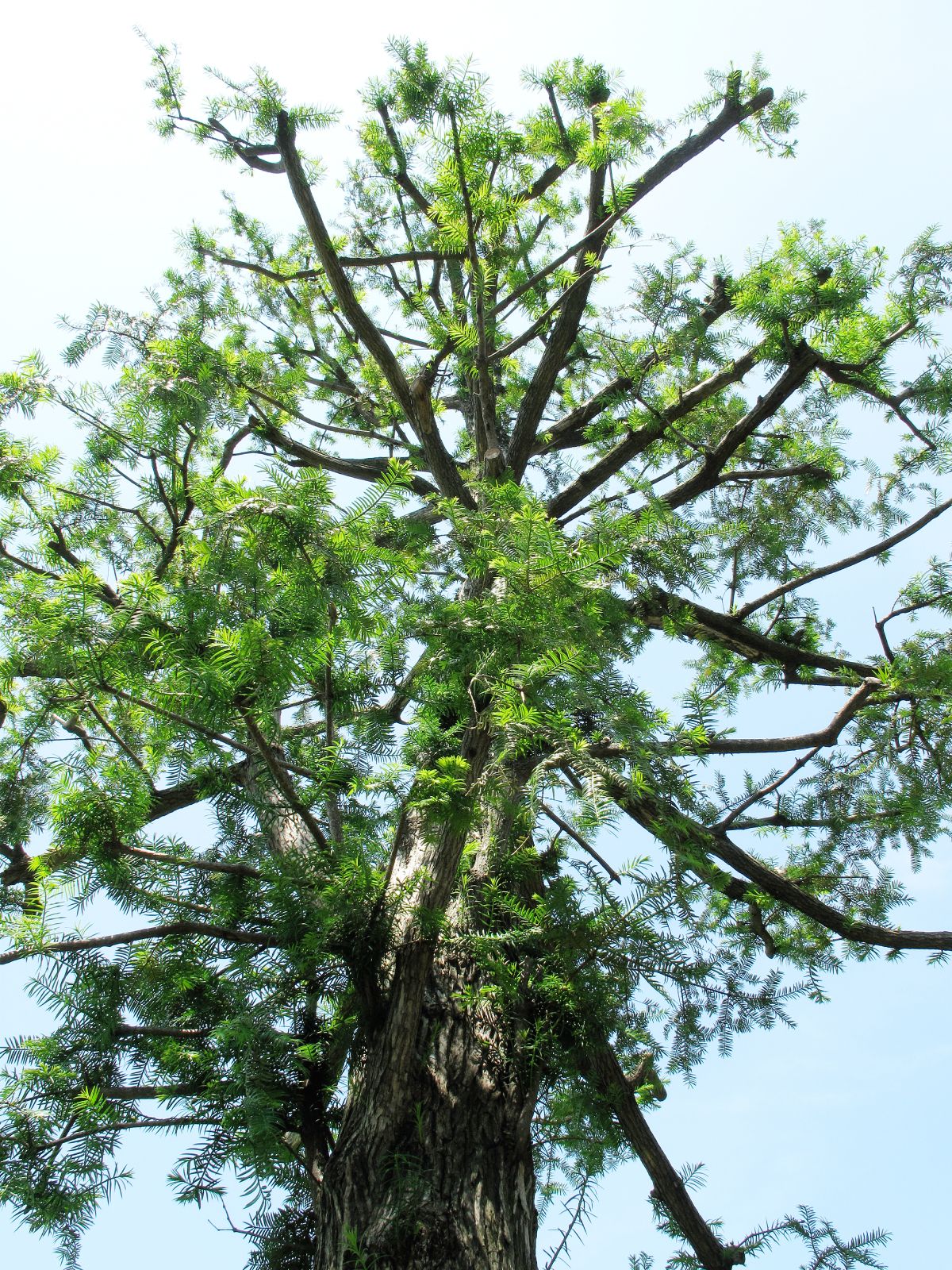下から仰ぐ構図が効いていて、幹は一本なのに枝が四方へ解放されている。生命が「まだ行ける」と腕を伸ばしている瞬間を、そのまま受け止めています。空が余計なことをせず、ほぼ無色なのも正解。緑が主役としてきちんと立っている。