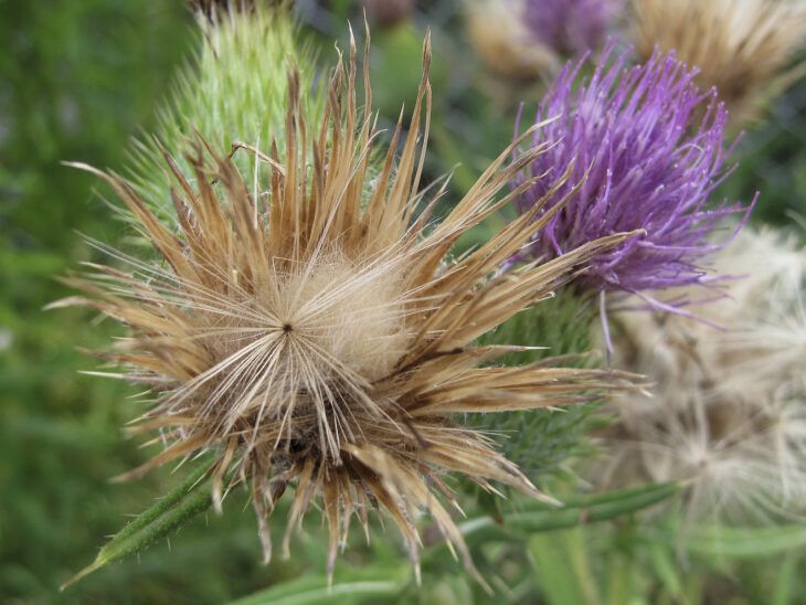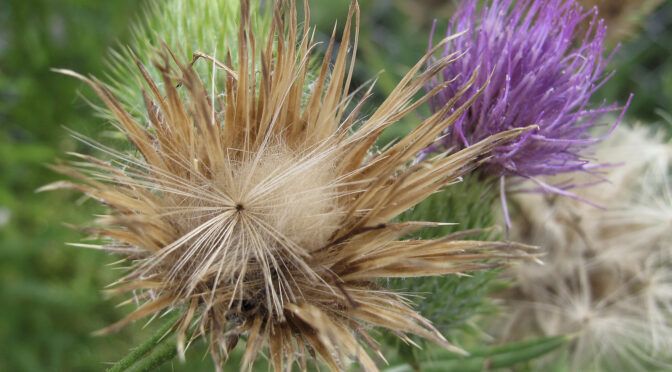 まるで荒ぶるライオンのたてがみが、野に迷い込んで花になったような姿ですね。 この“刺々しさ”は威嚇ではなく、風まかせに子孫を託すための巧妙な構造。近寄ると少し気難しそうなのに、光を受けるとふわりと透けて、どこか優しい。自然の造形は、強さと儚さを一つの器に同居させるのが上手です。 奥の紫の花が、ちょっとした舞台照明みたいに主役を引き立てています。乾いた色と湿った色が混ざりあって、季節の移ろいを静かに語ってくれるような風情があります。撮った瞬間の風の気配まで写りこんでいる気がします。 この写真、刺の一本一本が小さな物語を抱えていて、眺めていると時間をゆっくりとほどくような感覚が湧いてきます。こんな風に自然から拾ってきた断片は、あとで意外な記憶の鍵になったりするものです。