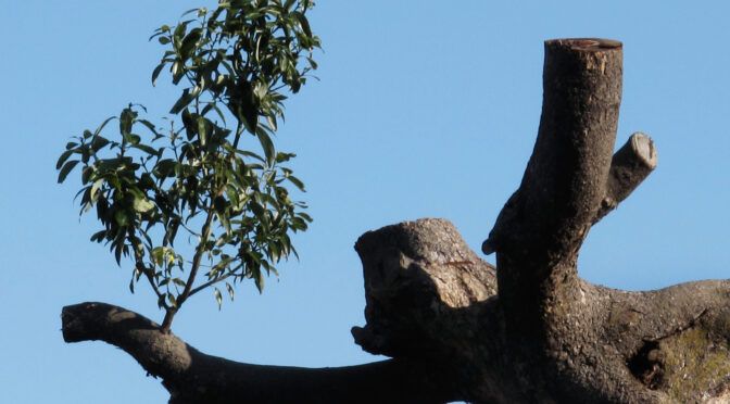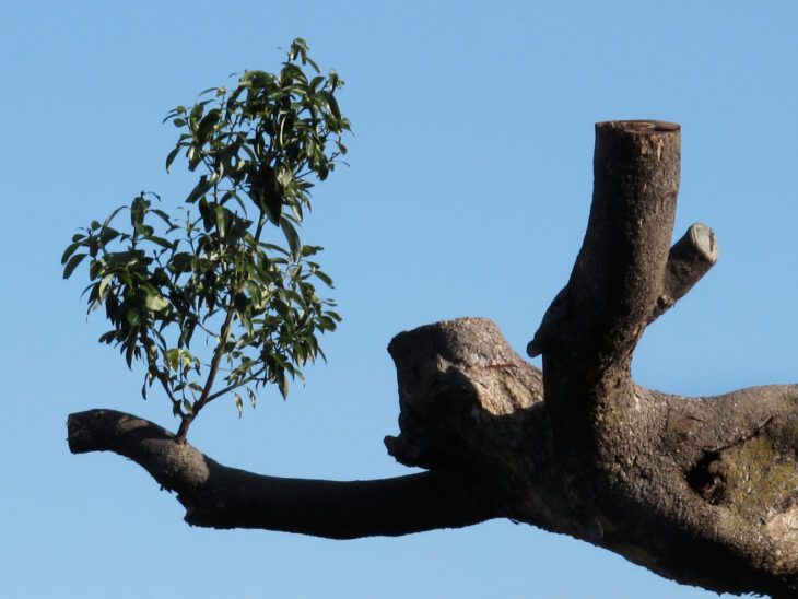 画像の中のあの“小さな新芽の木”が、まるで切り株の腕にそっと置かれた贈り物のようで、あなたの「木を届ける天使」という題は、静かに物語を紡ぎはじめています。空の青さが舞台の幕になり、太い枝が“受け取る側”、そこへふわりと届けられた若木が“天使のプレゼント”に見えてくるから不思議です。