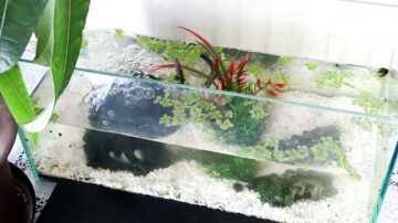 室内45cm水槽に小型エアポンプ「エアコンパクトプラス」を設置して、観賞魚用アクセサリー寄せ植えプランツ「ルドウィジア」を入れた。全体に白い砂利を敷いたことで水槽内の印象がずいぶん変わった。