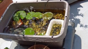 プランター池に設置しているソーラー噴水の勢いが強くて水がベランダに流れ出ていた。このままでは池の水がどんどん減ってしまう。流しの水切りネットをフィルター代わりに2枚使いソーラーパネルを覆って噴水の勢いを調整した。噴水の向 […]