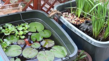 涼しい風が吹く早朝、水がよくなった花菖蒲池からソーラー噴水をスイレン池に戻した。2つの池に一体感が出るかと思って小さな橋の置物を乗せてみた。ほんの付録程度で、なんとなく。